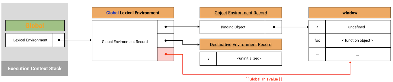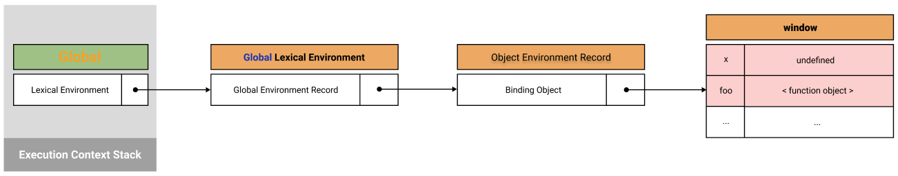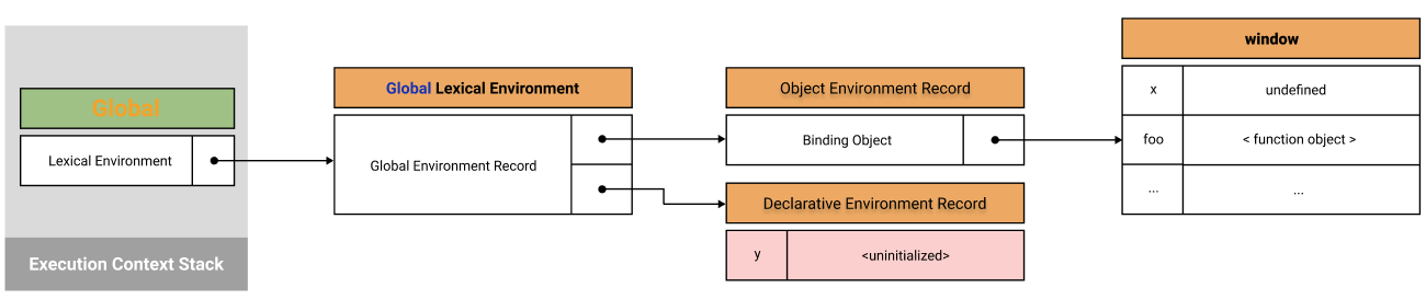 μ μ μ½λ νκ° λ¨κ³μμ κ°μ²΄ νκ²½ λ μ½λμ λ°μΈλ©λ BindingObjectλ₯Ό ν΅ν΄ μ μ κ°μ²΄μ λ³μ μλ³μλ₯Ό ν€λ‘ λ±λ‘ν λ€μ, μ묡μ μΌλ‘ undefinedλ₯Ό λ°μΈλ©νλ€. (letμ΄λ constλ "μ μΈ λ¨κ³"μ "μ΄κΈ°ν λ¨κ³"κ° λΆλ¦¬λμ΄ μ§νλλ€.)