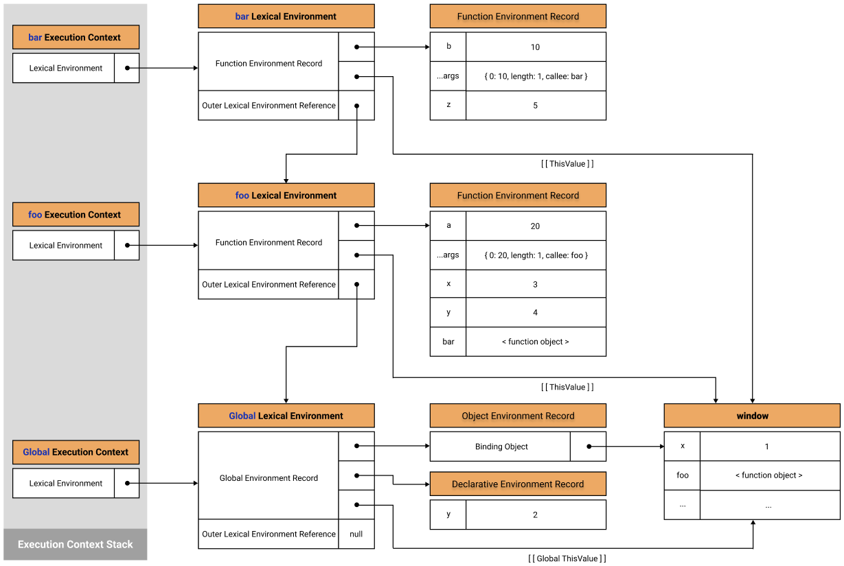 ν¨μ νκ²½ λ μ½λλ λ§€κ° λ³μ, arguments κ°μ²΄, ν¨μ λ΄λΆμμ μ μΈν μ§μ λ³μμ μ€μ²© ν¨μλ₯Ό λ±λ‘νκ³ κ΄λ¦¬νλ€.