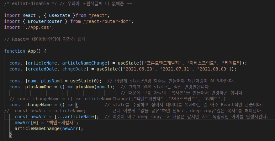 ๋ฐ์ดํฐ์ ์ํ๋ฅผ ๋ณํ์ํค๊ณ ์ถ์ ๋, useState๋ฅผ ์ฌ์ฉํด ๋ณต์ฌํด ์จ ๋ค์์ ๋ณ๊ฒฝ ์ฌํญ์ ์ ์ฉ์ํจ๋ค.