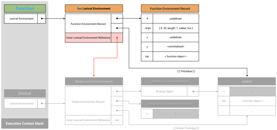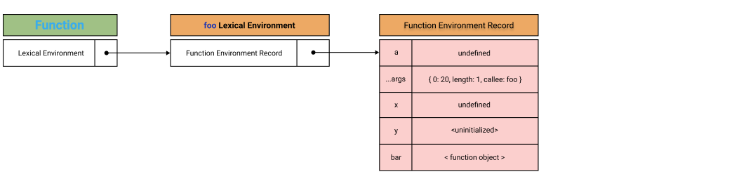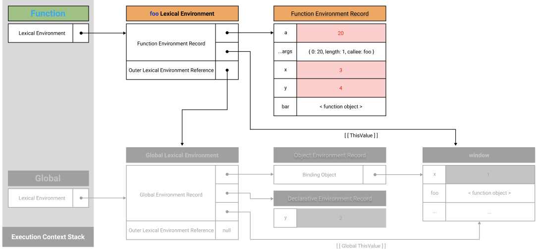 ν¨μ νκ²½ λ μ½λλ λ§€κ° λ³μ, arguments κ°μ²΄, ν¨μ λ΄λΆμμ μ μΈν μ§μ λ³μμ μ€μ²© ν¨μλ₯Ό λ±λ‘νκ³ κ΄λ¦¬νλ€.