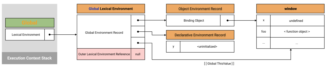 μ μ μ½λ νκ° λ¨κ³μμ κ°μ²΄ νκ²½ λ μ½λμ λ°μΈλ©λ BindingObjectλ₯Ό ν΅ν΄ μ μ κ°μ²΄μ λ³μ μλ³μλ₯Ό ν€λ‘ λ±λ‘ν λ€μ, μ묡μ μΌλ‘ undefinedλ₯Ό λ°μΈλ©νλ€. (letμ΄λ constλ "μ μΈ λ¨κ³"μ "μ΄κΈ°ν λ¨κ³"κ° λΆλ¦¬λμ΄ μ§νλλ€.)