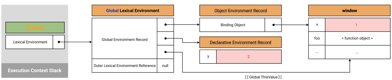 * κ°μ²΄ νκ²½ λ μ½λλ varν€μλλ‘ μ μΈν μ μ λ³μμ ν¨μ μ μΈλ¬ΈμΌλ‘ μ μν μ μ ν¨μ, μ μ κ°μ²΄μ λΉνΈμΈ μ μ νλ‘νΌν° / λΉνΈμΈ μ μ ν¨μ / νμ€ λΉνΈμΈ κ°μ²΄λ₯Ό κ΄λ¦¬νλ€. varν€μλλ‘ μ μΈν μ μ λ³μμ ν¨μ μ μΈλ¬ΈμΌλ‘ μ μν μ μ ν¨μλ μ°κ²°λ κ°μ²΄ νκ²½ λ μ½λμ BindingObjectλ₯Ό ν΅ν΄ μ μ κ°μ²΄μ νλ‘νΌν°μ λ©μλκ° λλ€.