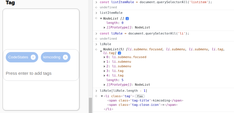 listitem์ด ๊ฐ์ง ๋ฐฐ์ด์ ๋ง์ง๋ง ์ธ๋ฑ์ค ๊ฐ์ textContent์ ๋ฌธ์์ด ๋ณต์ฌ๋ณธ์ 'kimcoding'์ด์๋ค.